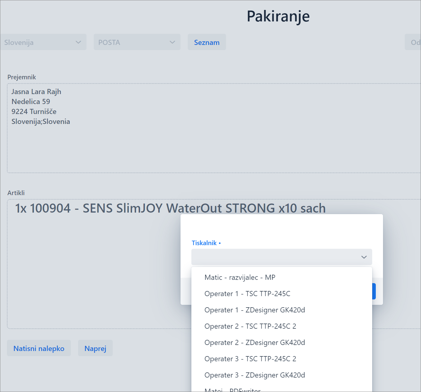 4. Izberite tiskalnik ob prvem tiskanju v Odprema aplikaciji.
