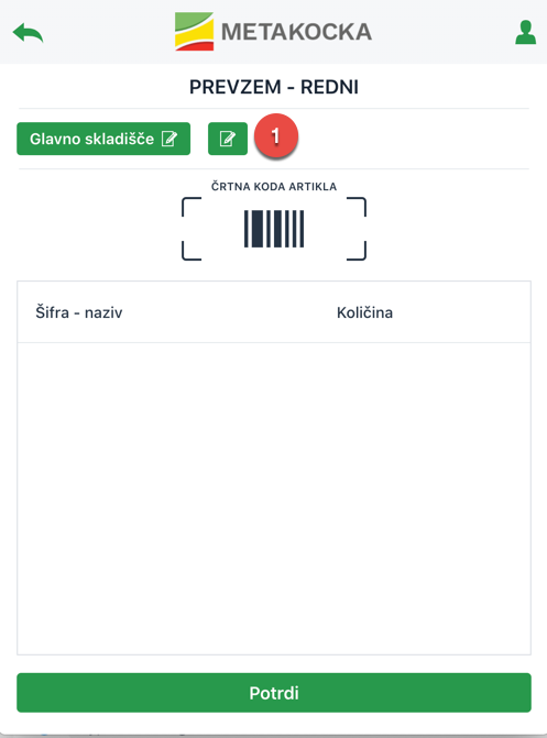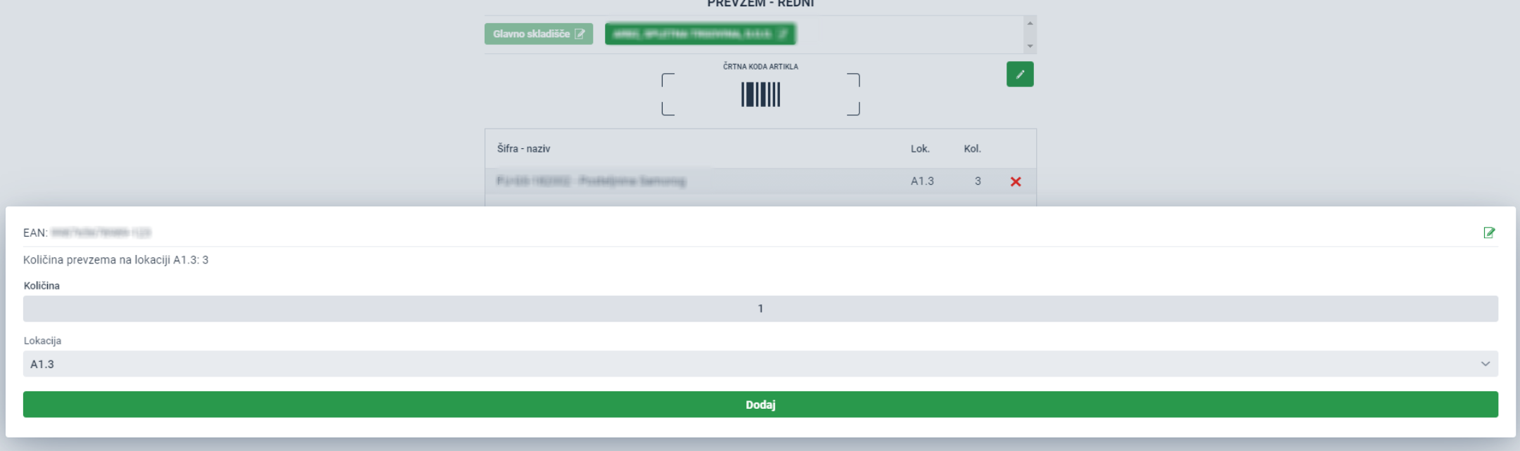 Ko skenirate se vam bo na čitalcu prikazala prebrana ean koda uvrstila v seznam. Odpre se nov dialog, kamor vpišete prevzemne količine in mikrolokacijo v kolikor imate le te uporabljene za skladiščenje.