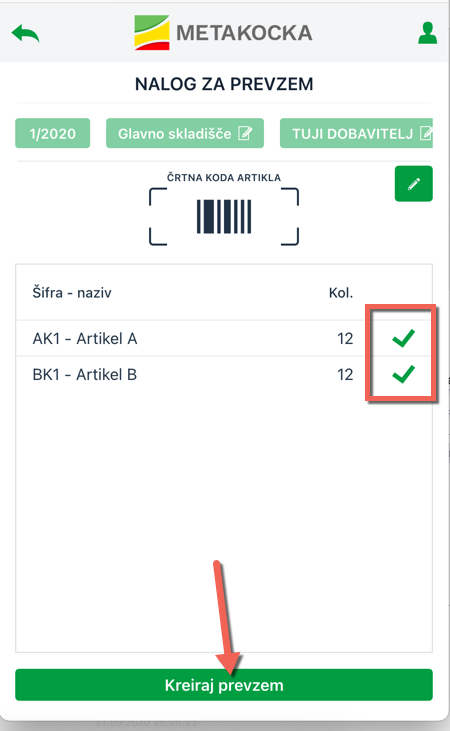 Na ekrani se bodo prikazali artikli, ki so na izbranem nalogu za prevzem