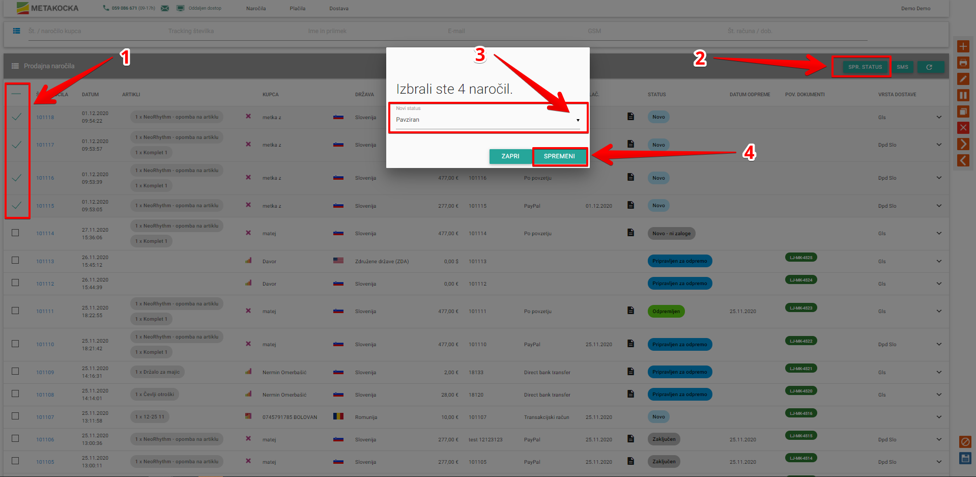 1. Izberete prodajna naročila, ki jim želite spremeniti status