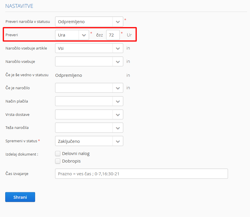 Izberete lahko tudi, po kolikšnem času naj se naročila v tem statusu spremenijo, na primer 72 ur po tem, ko naročilo dobi izbran status.
