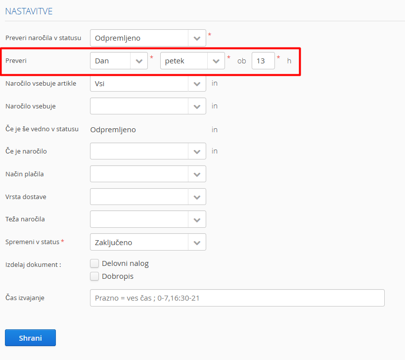 Izberete lahko tudi dan v tednu ter uro, na katerega naj se preverijo statusi in se nato ustrezno spremenijo.