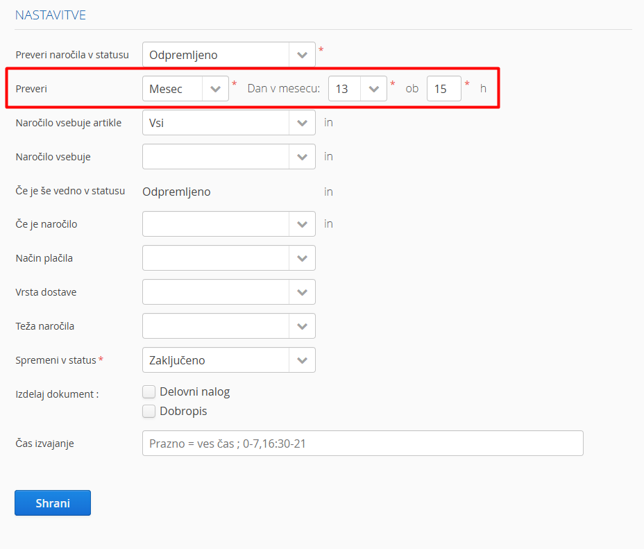Nastavite lahko, da se naročila, ki so v določenem statusu, ob določenem času samodejno premaknejo v drug status.