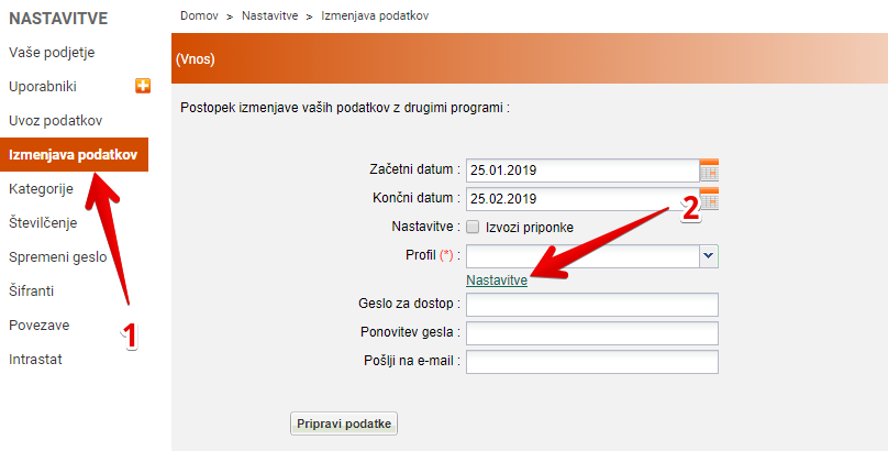 Prvi korak - potrebno je nastaviti izmenjavo podatkov za računovodstvo. Spodaj navodila.