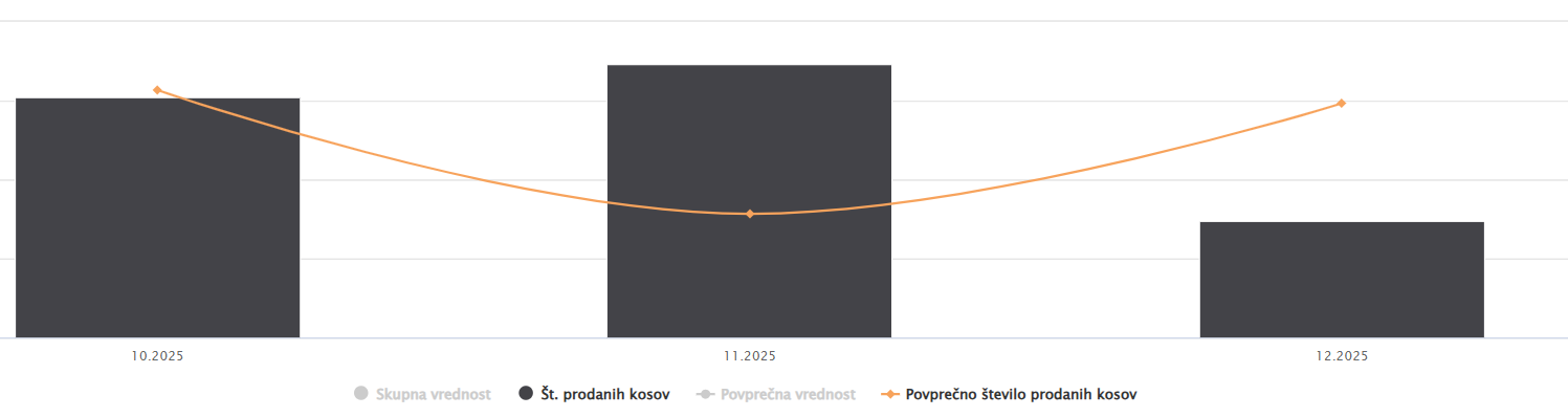 Povprečno število prodanih kosov - prikazuje povprečno število kosov znotraj naročil v izbranem obdobju