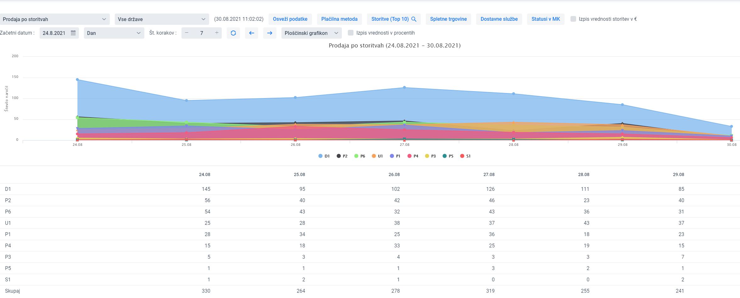 Izberete časovni okvir za prikaz prodaje, na voljo so različni filtri: