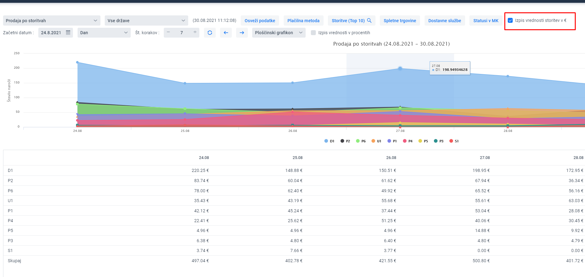 Graf omogoča tudi prikaz vrednosti storitev v izbranem časovnem obdobju: