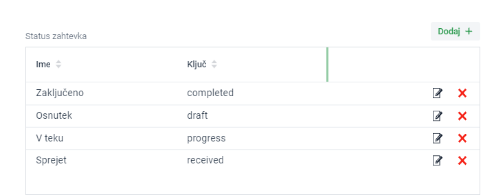 Privzeti status za vse izdelane zahtevke. Privzeti status omogoča avtomatsko izbiro končnega statusa noročila po izdelanem zahtevku.