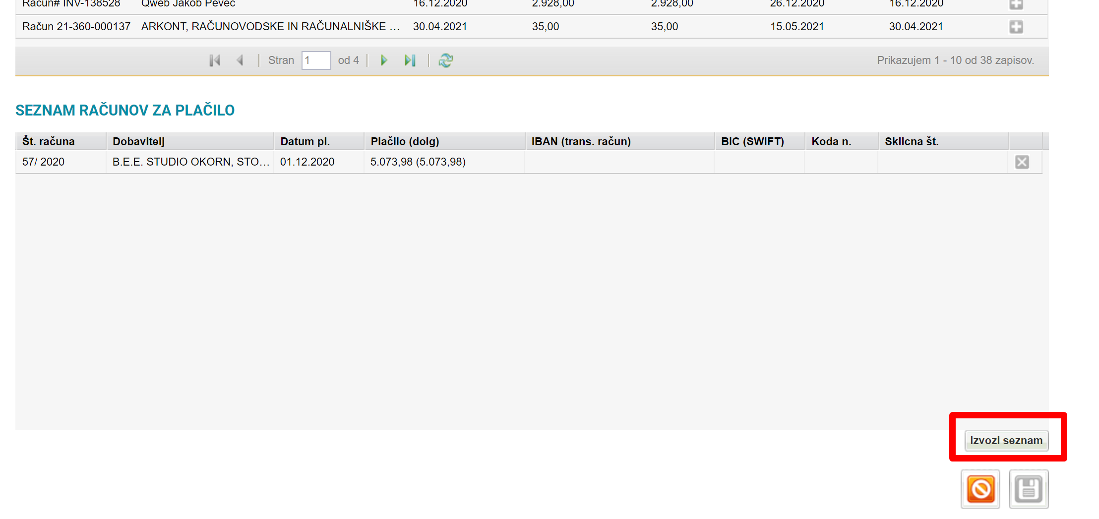 Ko je zahtevek zaključen na vhodni strani pod filtrom Zaključeno, najdete možnost za prenos naročil v Banka, plačilo: