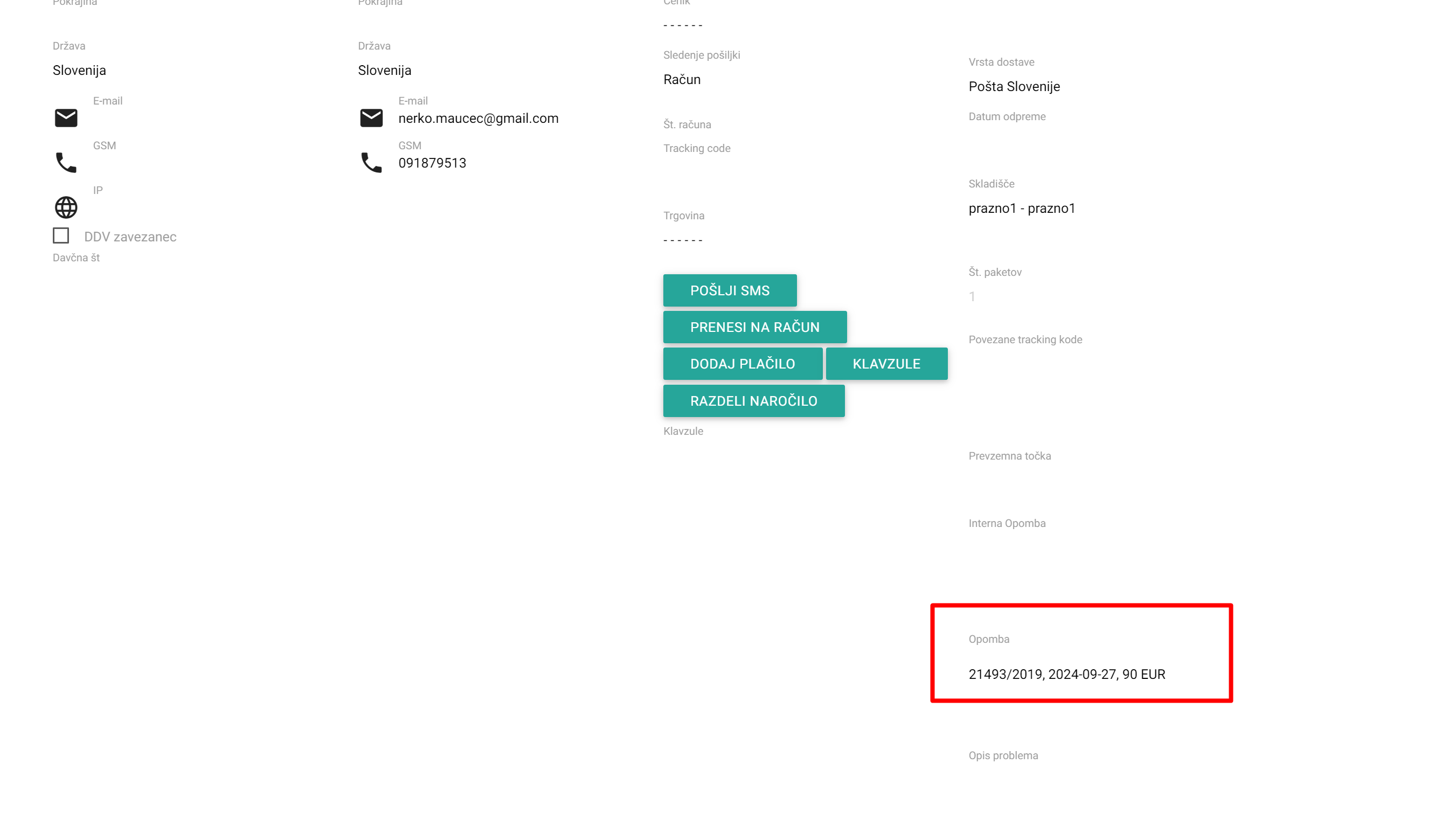 Na novem naročilu, pa se vam pod opombe izpišejo podatki o vračilu le-tega paketa.