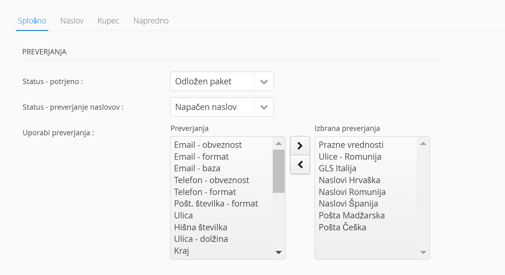 Ob vključenem preverjanju se preverja prisotnost hišne številke v naslovu, z izjemami Irske in Grčije. Naročila z manjkajočo hišno številko bodo premaknjena v status problem.