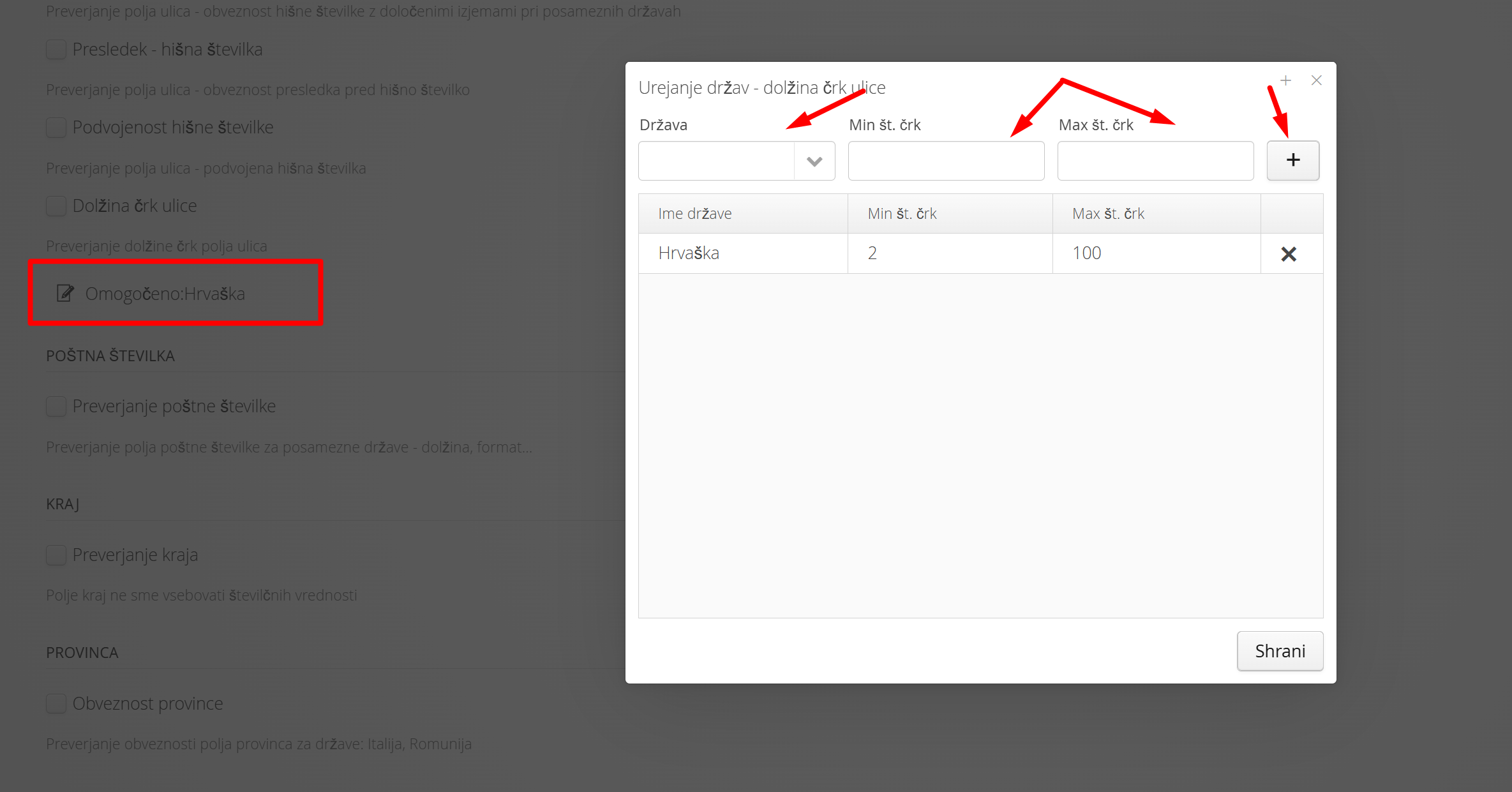 Ob izbiri funkcionalnosti se preverja dolžina polje ulice, ki ga navedete:
