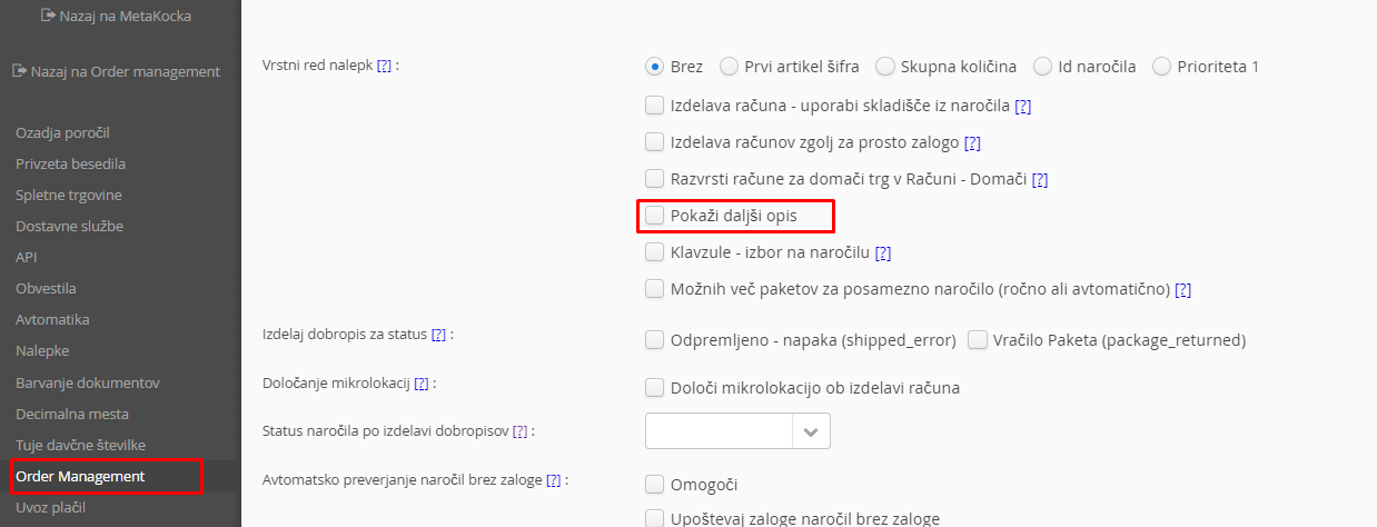 Funkcionalnost vklopite v dodatnih nastavitvah/OrderManagement/ Prikaži daljši opis