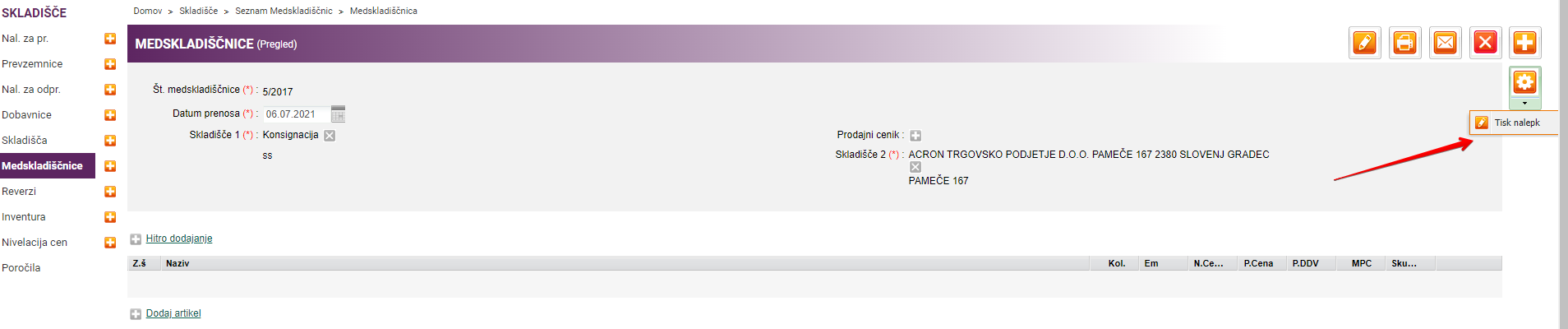 3. Deklaracije je mogoče natisniti iz seznama artiklov ter dokumentov prevzemnica, dobavnica in medskadiščnica.