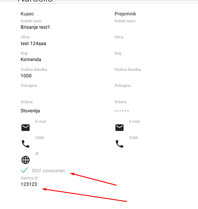 Ob vklopu funkcionalnosti, boste na prodajnem naročilu lahko označili kupca kot DDV zavezanca in mu vpisali davčno številko, ki se ob vpisu zabeleži na podatke kupca: