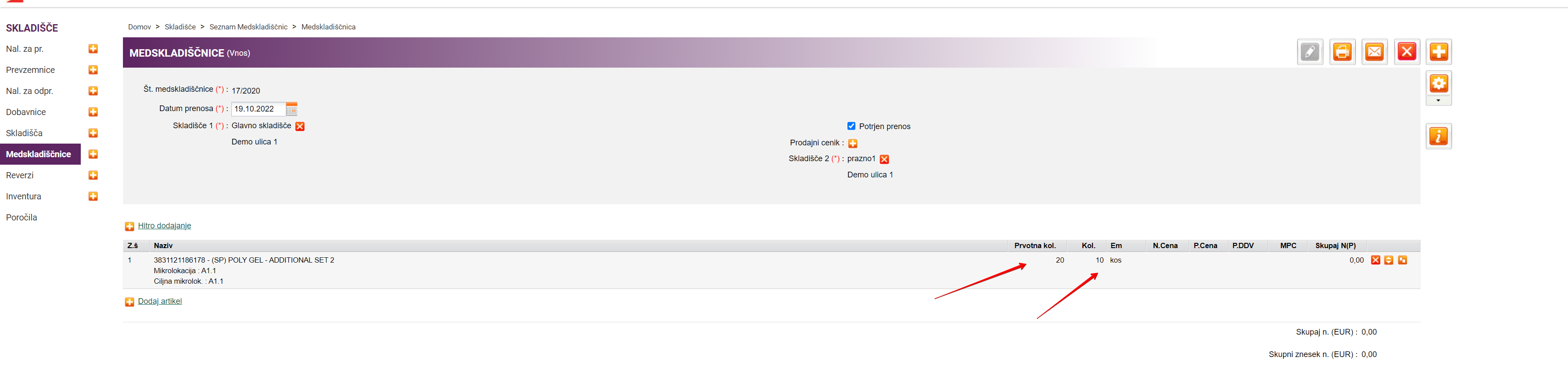 Zalogo potrdite v celoti oz. popravite količino in potrdite količino, ki ste jo prejeli. Po končani potrditvi artiklov potrdite še celotno Medskladiščnico. Prenos zaloge med skladišči bo narejen le za zalogo, ki jih boste potrdili.