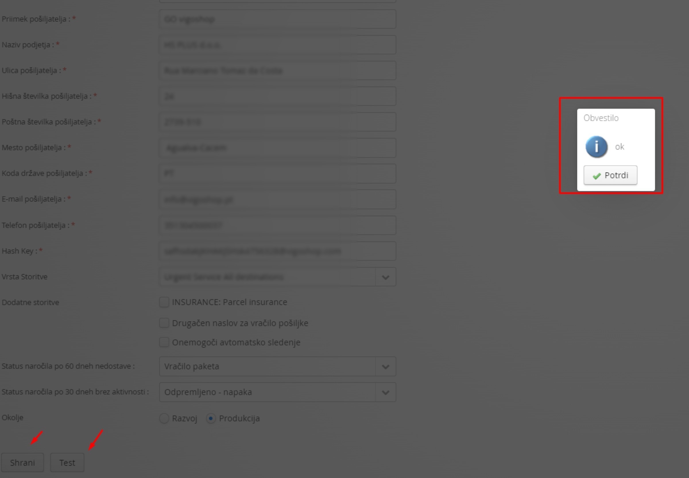 Shranite vnesene podatke in s klikom na "Test povezave" preverite pravilnost vnesenih podatkov.