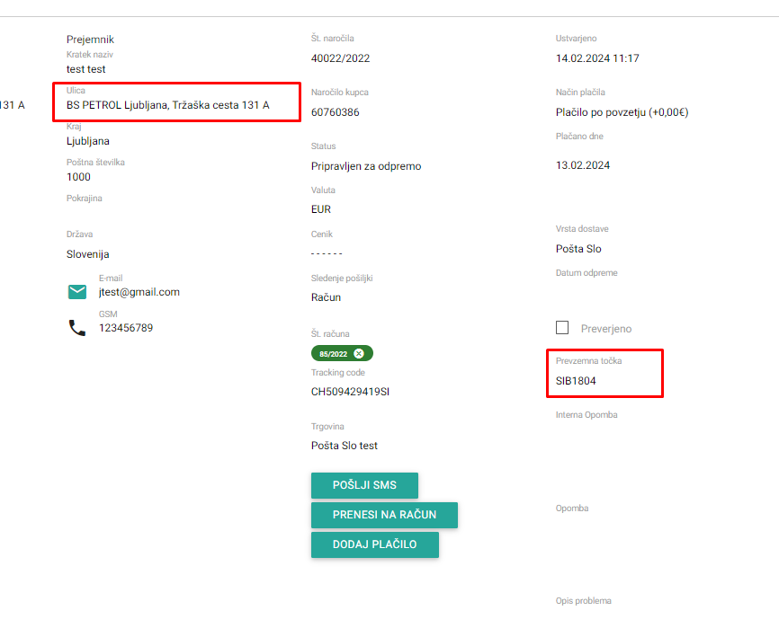 V kolikor uporabljate prevzemna mesta, je potrebno naslov zapisati: