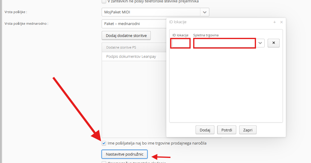 Nato določite ID lokacije, ki je vezana na spletno trgovino / ime pošiljatelja. ID lokacije morajo v tem primeru predhodno biti kreirane na strani Pošte Slovenije.