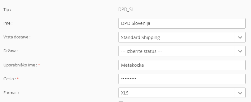 3. Vpišite podatke, geslo in uporabniško ime, ki ste ju prejeli od DPDja, določite novo vrsto dostave, ki jo boste uporabljali za dostavno službo Pošta Hrvaška, lahko dodate novo (+)