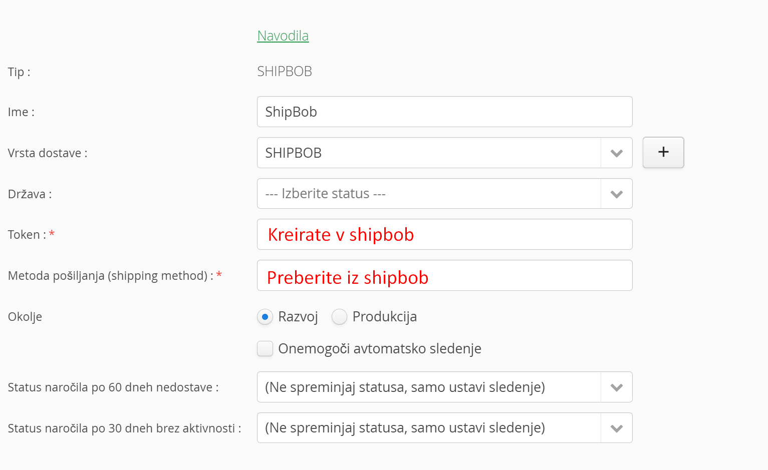 V dodatne nastavitve/ Dostavne službe, dodate povezavo ShipBob ter vpište zahtevane podatke.
