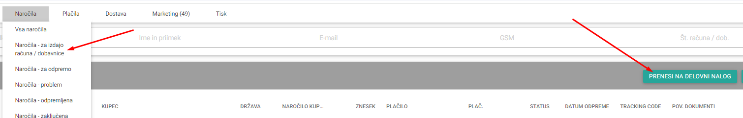S klikom na Naročila za izdajo računa je prikazan gumb prenesi na Delovni nalog
