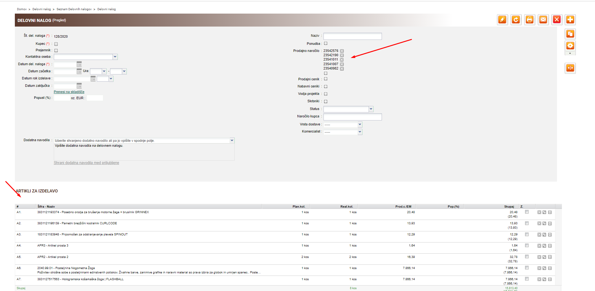 Prenos artiklov iz prodajnega naročila na delovni nalog