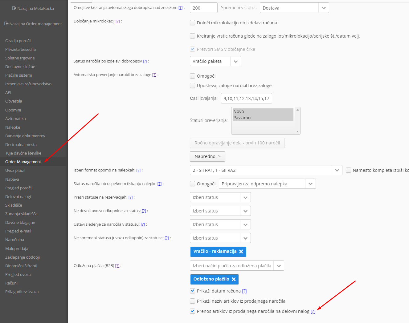 V dodatnih nastavitvah / Order Management izberete: