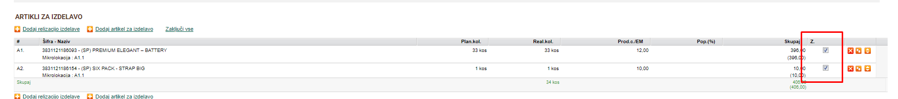 Ob zaključenem delovnem nalogu, se zaloga ustvari na skladišču, naročilom pa se spremeni status v Novo, kjer se potem izdelajo računi za izbrana naročila.