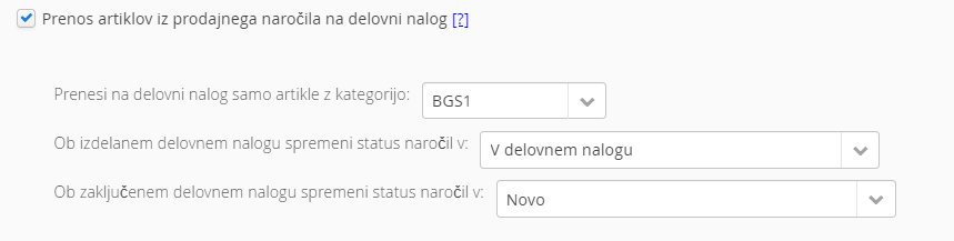 - kategorijo artiklov, ki se prenesejo na delovni nalog. Pri kreaciji delovnega naloga se bodo na delovni nalog prenesli samo artikli, katerim je določena izbrana kategorija: