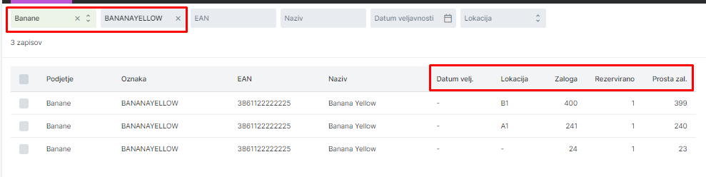 V razdelku Skladišče je prikazan pregled zaloge, katero lahko iščete po izbranih filtrih: