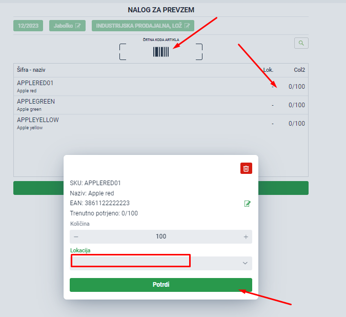 Skeniramo artikel ali ga ročno vpišemo ter določimo količino, katero prevzemamo
