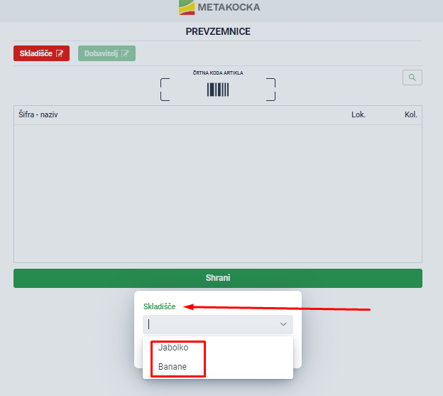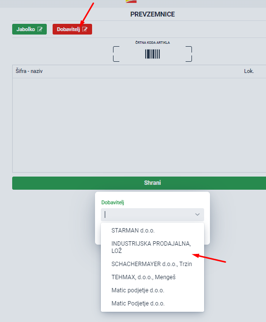 Pod razdelkom skladišče izberemo za katero podjetje prevzemamo zalogo: