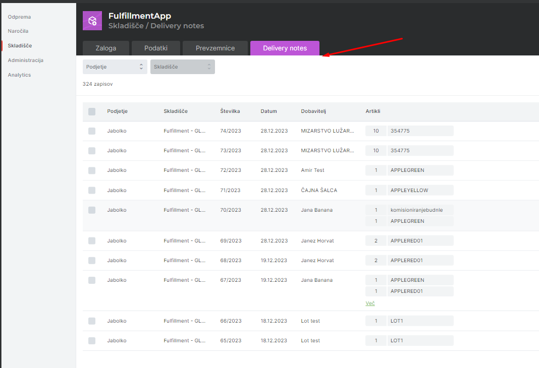 Pregled kreiranih dobavnic je viden tudi v Fulfillment aplikaciji: