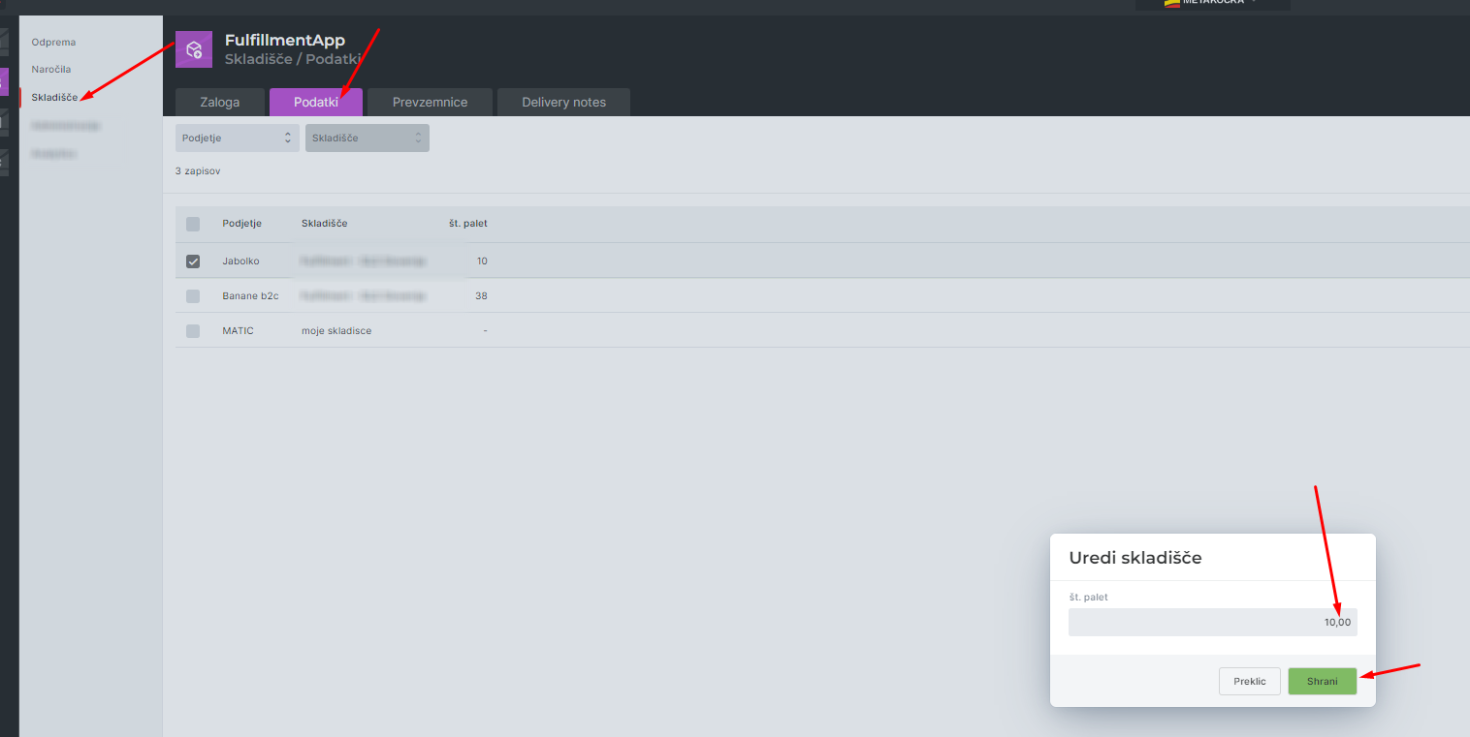 V podatkih lahko vpišete podatek o številu palet, ki jih trenutno zaseda zaloga izbranega podjetja:
