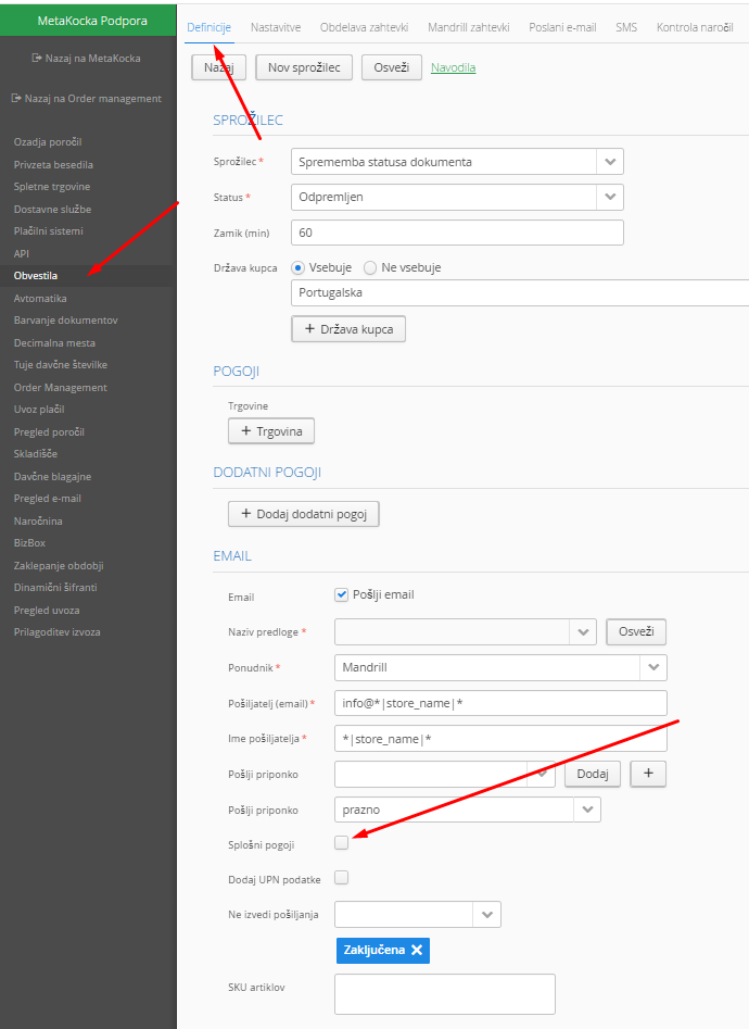 2. Pri nastavitvi pošiljanja obvestil obkljukate Splošni pogoji, in le ti se bodo glede na domeno/oznako spletne trgovine pri pošiljanju tudi dodali: