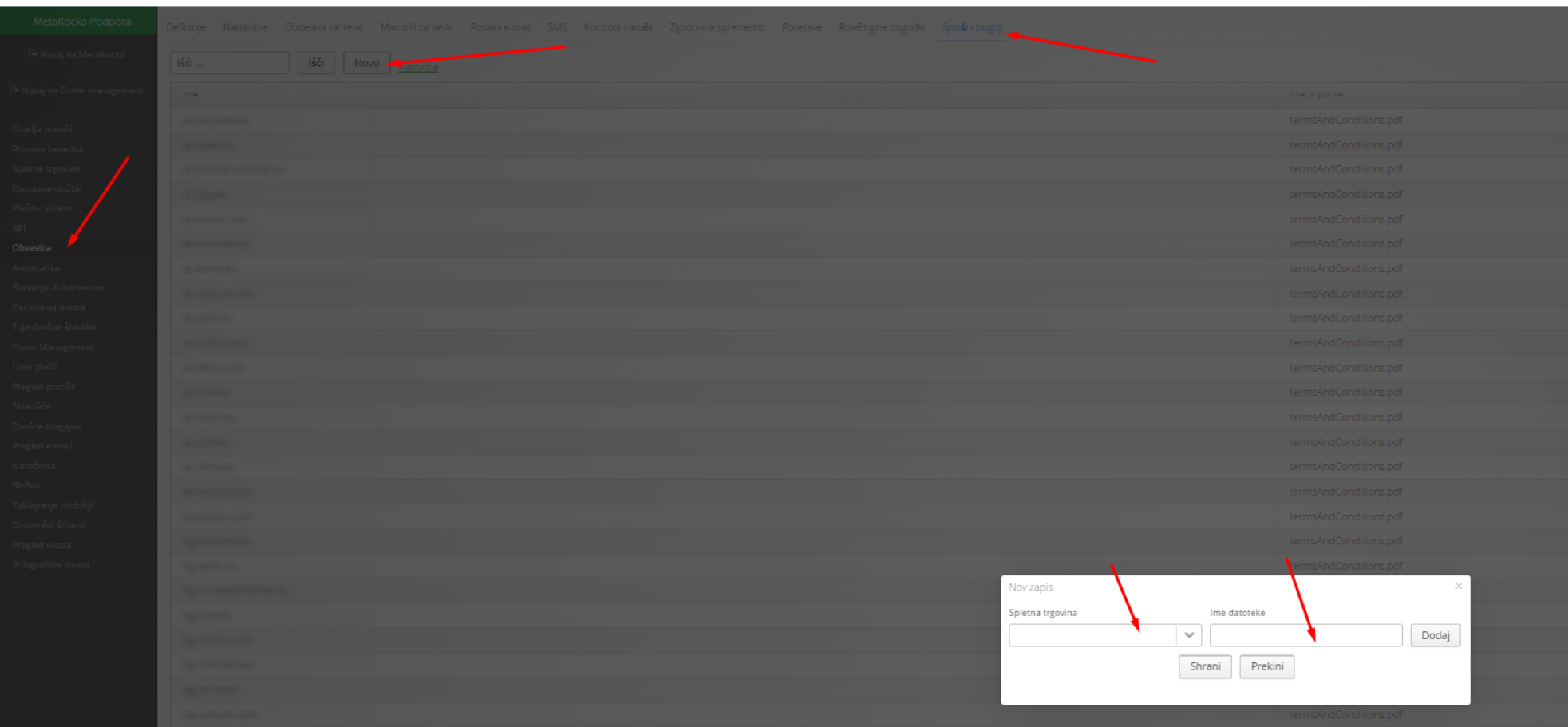 - ročno dodajanje: Dodatne nastavitve/Obvestila/Splošni pogoji, kjer navedete za katero spletno trgovino splošni pogoji veljajo, ter naložite datoteko: