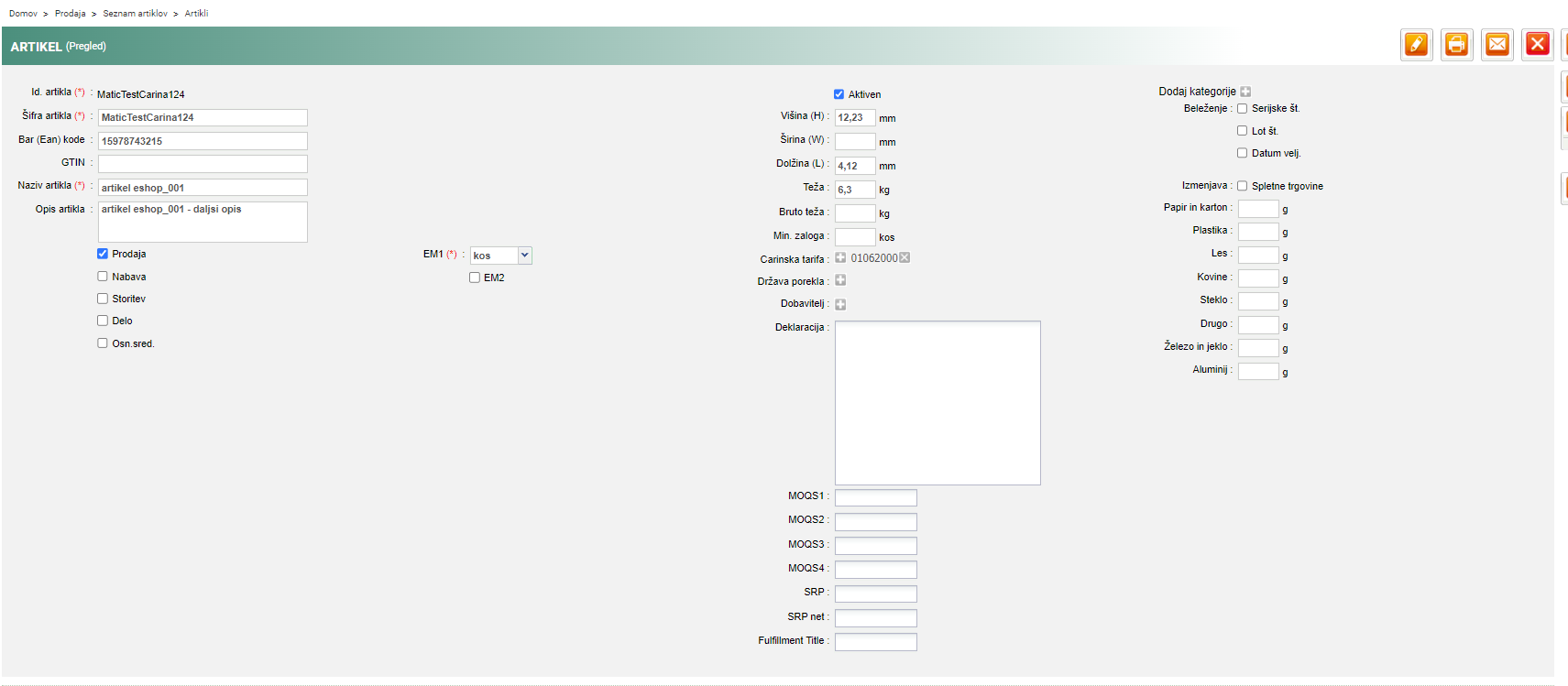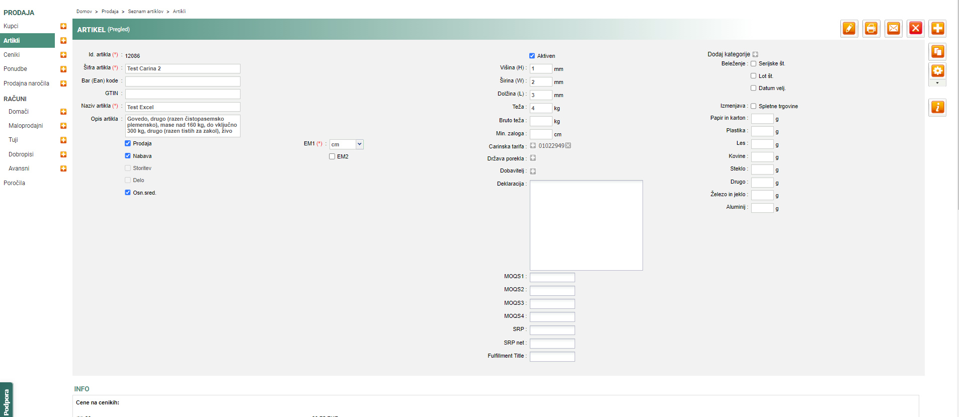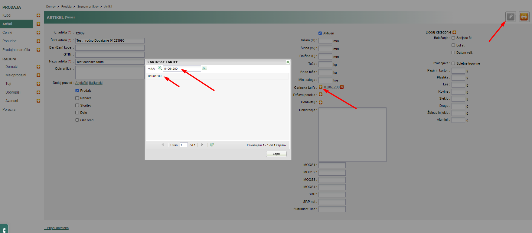 V. Preverimo artikel da je pravilno vnešen