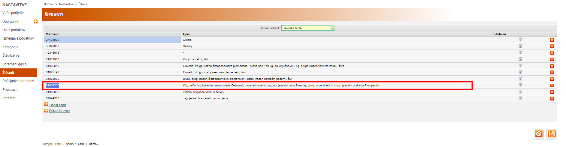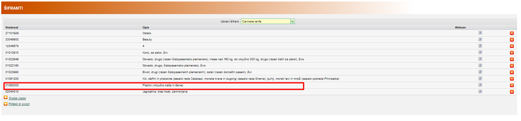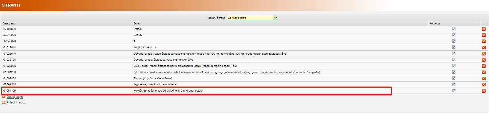 V. Osvežimo carinske tarife in vidimo nov šifrant.