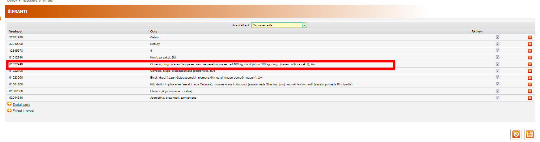 - 2/2 prikaz carinske tarife v šifrantih.
