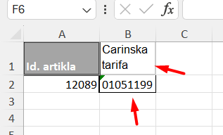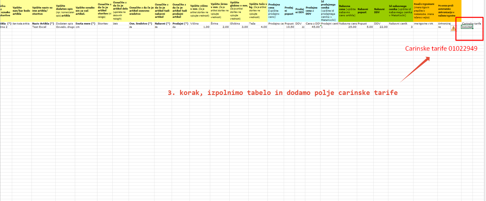 III. V excel tabeli za dodajanje artiklov dodamo polje carinskih tarif in primerno kodo (prikaz spodaj, 2. slika)