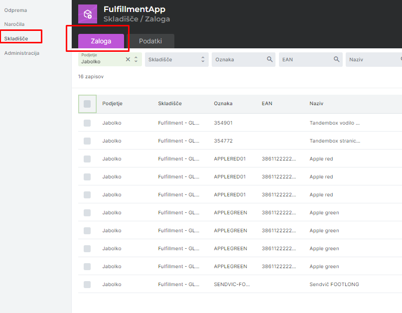 V Fulfillment aplikaciji je na voljo pregled zaloge po podjetjih za katere se zagotavlja fulfillment storitev.
