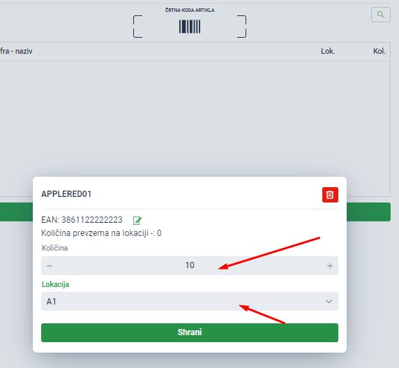 Skeniramo artikel ali ga ročno vpišemo ter določimo količino, katero prevzemamo