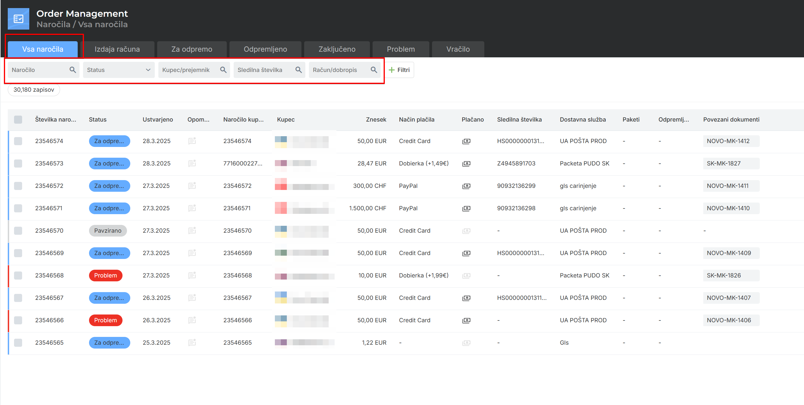 - Status : Tu lahko iščete po statusu prodajnega naročila.