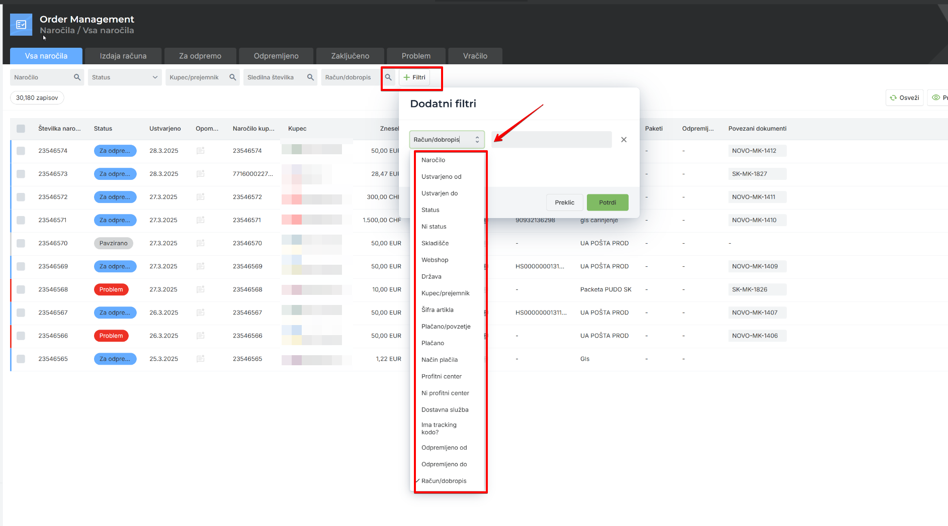 Pri iskanju naročil prav tako lahko uporabite dodaten filtre :