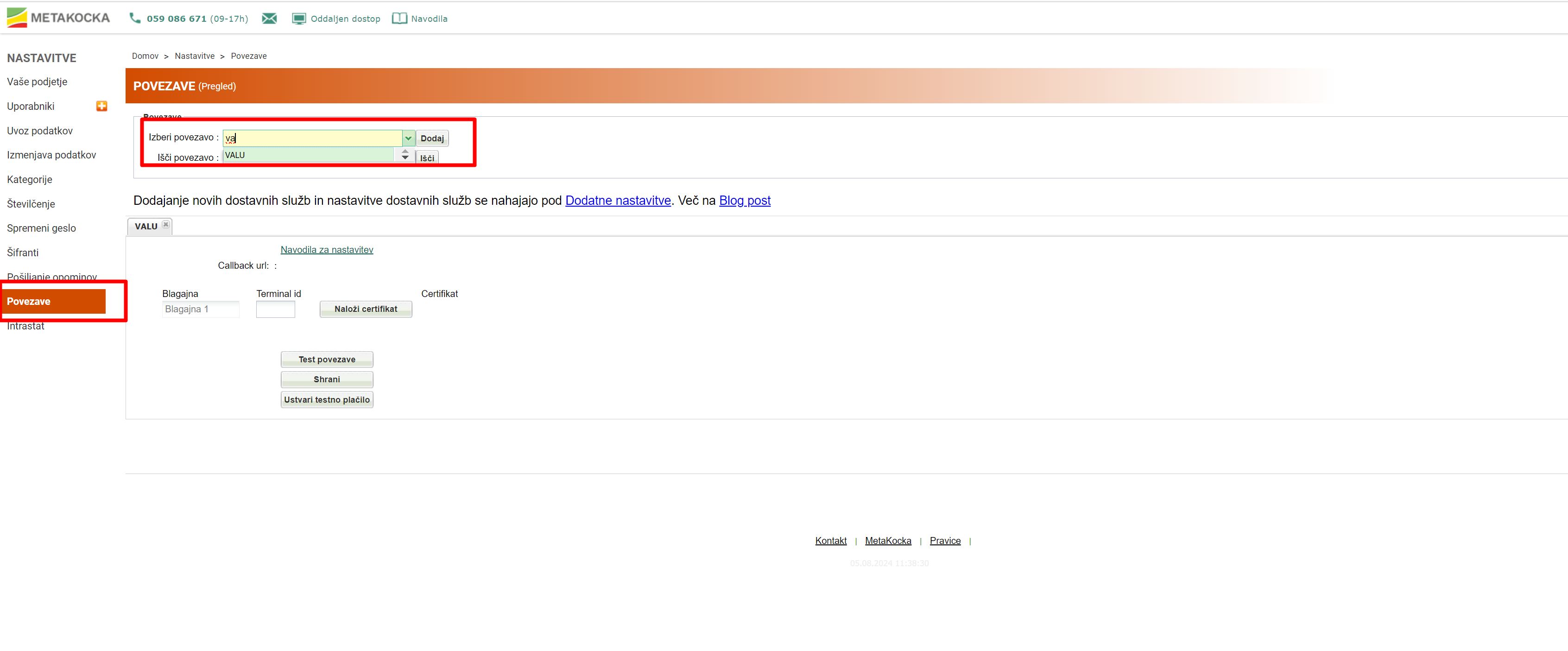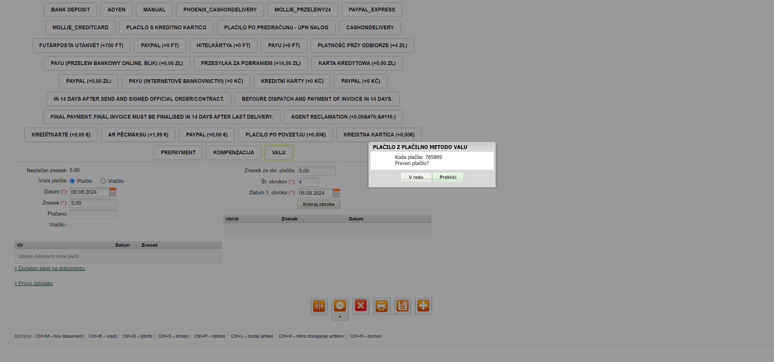 - Za način plačila izberite VALÚ (ta način plačila se vam kreira takoj ob povezavi s VALÚ).