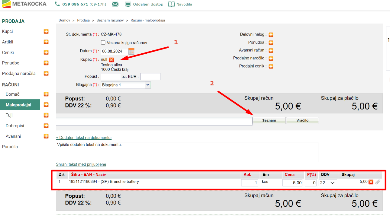 Ustvarite maloprodajni račun, izberite kupca in vnesite artikle.