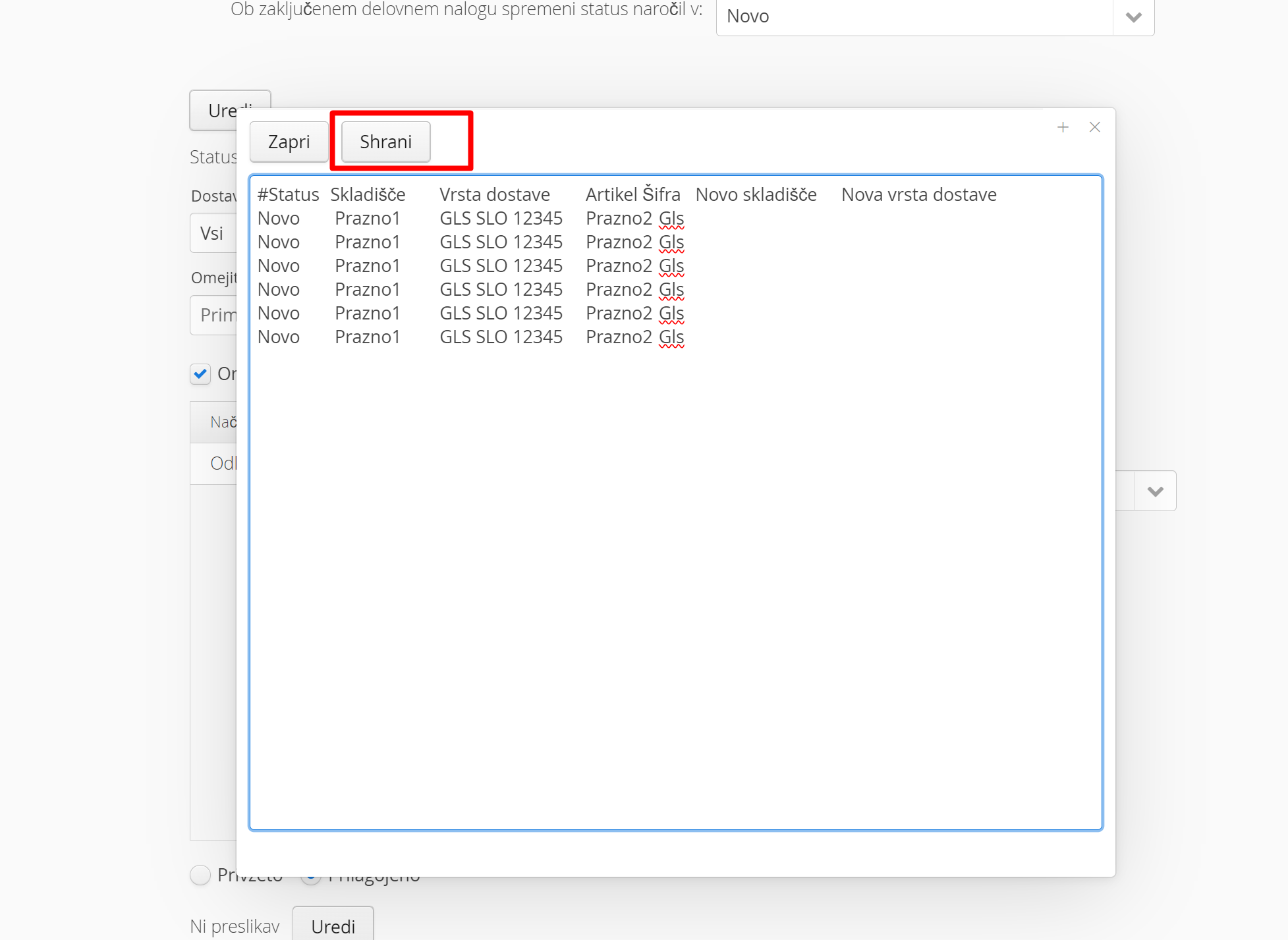- začetni stolpci Status, Skladišče, Vrsta Dostave, Artikel Šifra lahko vsebujejo več vrednosti, vendar morajo biti le te ločene s vejico. Vrednosti Novo skladišče in Nova vrsta dostave sta samo eni in ne smeta biti ločena s vejico