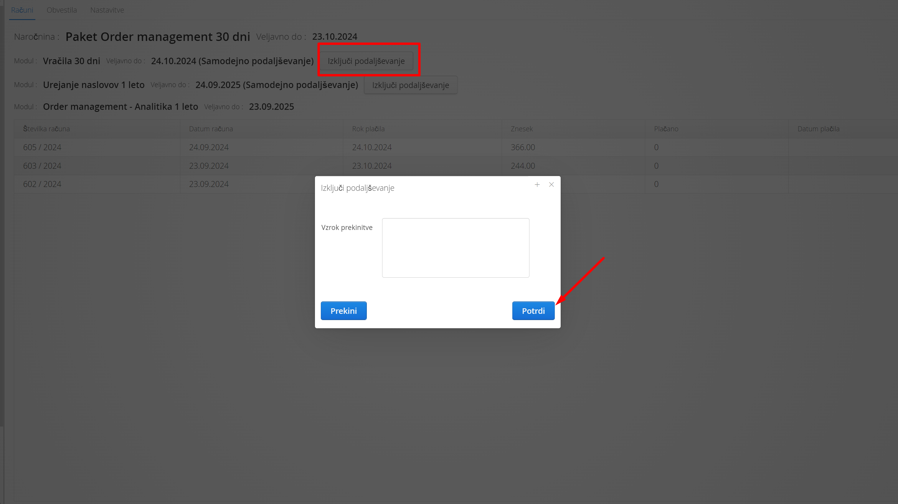 Ob kliku ''izključi podaljševanje'' sem vam pojavi okno, v katerega napišite razloge za prekinitev in podpora vam uredi zaključek.