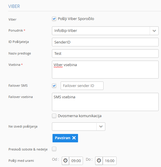 Failover SMS: v kolikor prejemnik nima Viber aplikacije, lahko označite, da se v tem primeru pošlje SMS, zato je potrebno določiti kateri Sender se bo v primeru SMSa nastavil